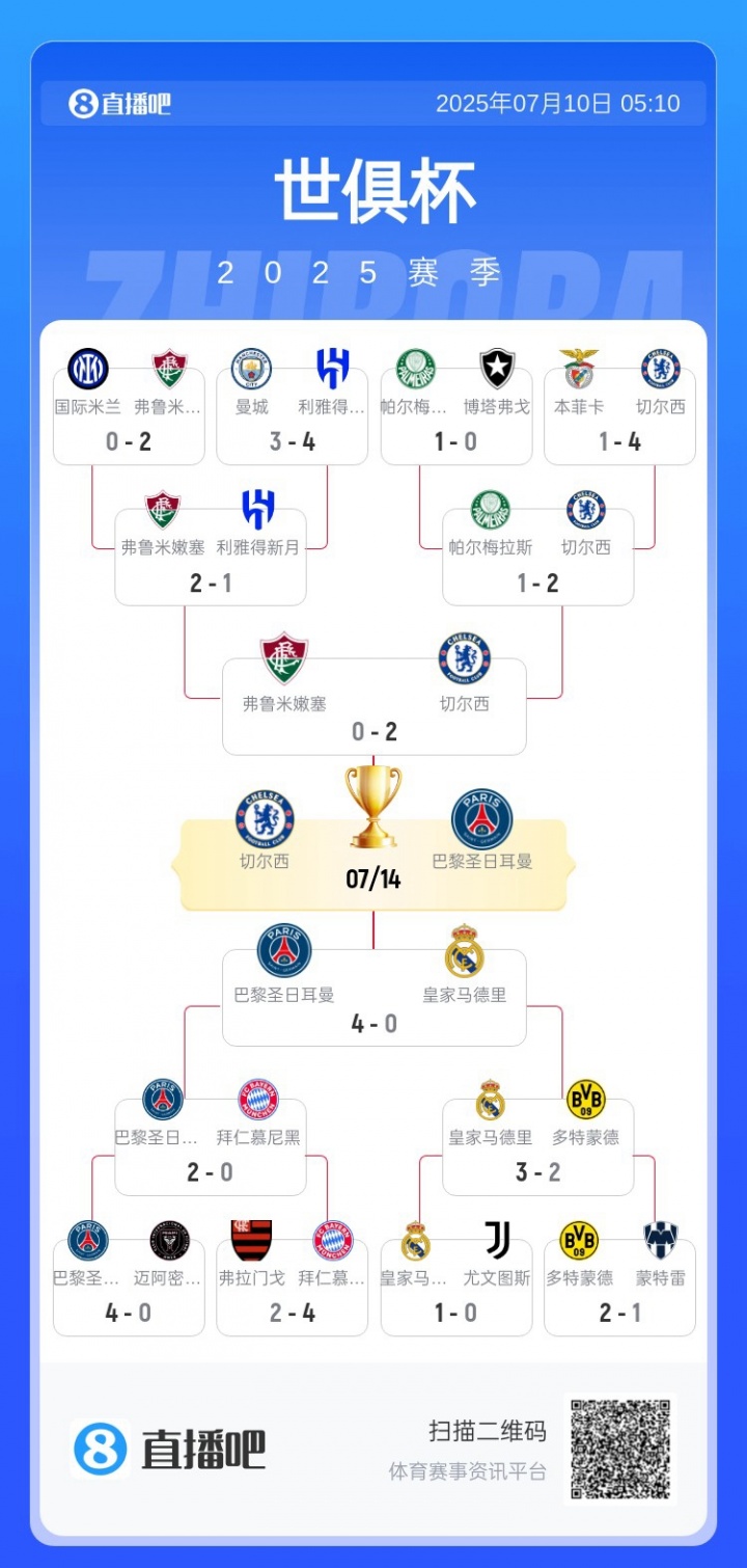 7月10日讯 世俱杯半决赛,巴黎4-0大胜皇马,决赛将战切尔西。